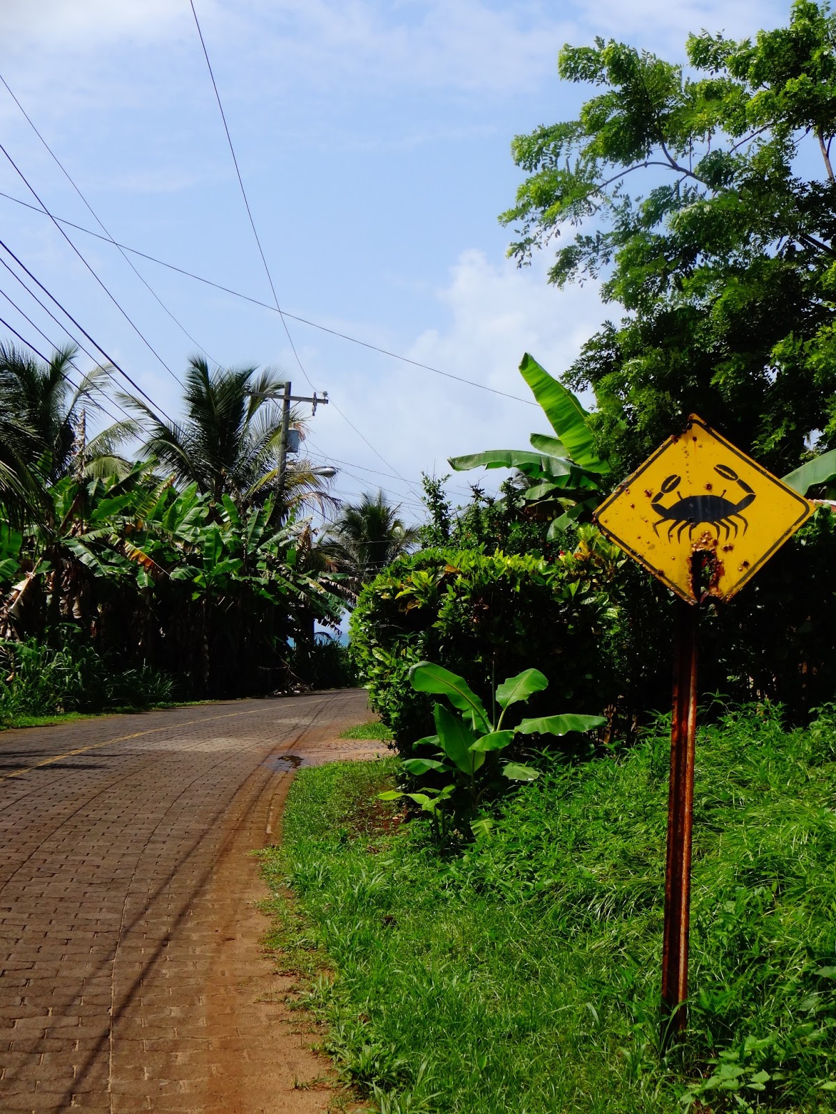 - Caught in a rainstorm. Tried to wait it out under cover, gave up, got soaked in warm, tropical shower. Worth every drop and every step. Passed variety of churches - one, a well established Episcopal Church, another just a gather space in a garage. Crab Crossing signs; No Passing car signs. Beaches with a view of Little Corn Island.